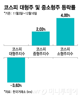 ÃÖ±Ù±îÁö ¹®Á¦·Î Á¦±âµÆ´ø '´ëÇüÁÖ ½ò¸²Çö»ó'ÀÌ »ç¶óÁø ¸ð½ÀÀÌ´Ù. ¿Ãµé¾î Áö³ 10¿ù31ÀϱîÁö ÄÚ½ºÇÇ ´ëÇüÁÖ Áö¼ö´Â 78.3% ±ÞµîÇß´Ù. ¹Ý¸é ÁßÇüÁÖ¿Í ¼ÒÇüÁÖ »ó½Â·üÀº °¢°¢ 41.11%, 17.21%·Î »ó´ëÀûÀ¸·Î ºÎÁøÇß´Ù. ƯÈ÷ ¼ÒÇüÁÖ »ó½Â·üÀº ´ëÇüÁÖÀÇ 5ºÐÀÇ 1 Á¤µµ¿¡ ±×Ä¡¸ç '´ëÇüÁÖ ½ò¸²Çö»ó'ÀÌ µÎµå·¯Á³´Ù.