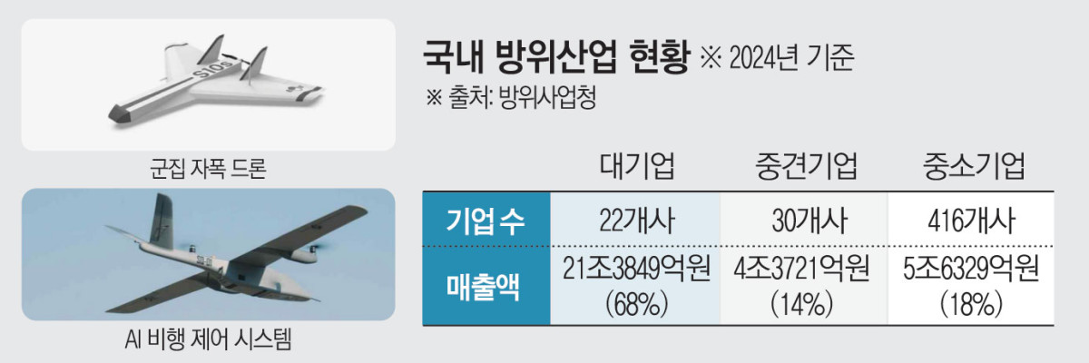 1ÀÏ ¹æÀ§»ç¾÷ûÀÇ ¡®¹æÀ§»ê¾÷ ½ÇÅÂÁ¶»ç¡¯¿¡ µû¸£¸é 2024³â ±âÁØ ±¹³» ¹æ»ê ´ë±â¾÷Àº 22°³»ç, Áß°ß±â¾÷Àº 30°³»ç, Áß¼Ò±â¾÷Àº 416°³»ç´Ù. ¸ÅÃâÀº ¡â´ë±â¾÷ 21Á¶3849¾ï¿ø(68%) ¡âÁß°ß±â¾÷ 4Á¶3721¾ï¿ø(14%) ¡âÁß¼Ò±â¾÷ 5Á¶6329¾ï¿ø(18%)À¸·Î Áý°èµÆ´Ù. Áß°ß¡¤Áß¼Ò±â¾÷ÀÌ ÀüüÀÇ 95%¸¦ Â÷ÁöÇÏÁö¸¸ ¸ÅÃâÀÇ 70%°¡ ´ë±â¾÷¿¡ ½ò·Á ÀÖ´Ù. ¹æÀ§»ê¾÷ÀÇ ´ë±â¾÷ ÆíÁß ¸ÅÃâ ±¸Á¶´Â °³¼±ÀÌ ½Ã±ÞÇÏ´Ù´Â ÁöÀûÀÌ ³ª¿Â´Ù.